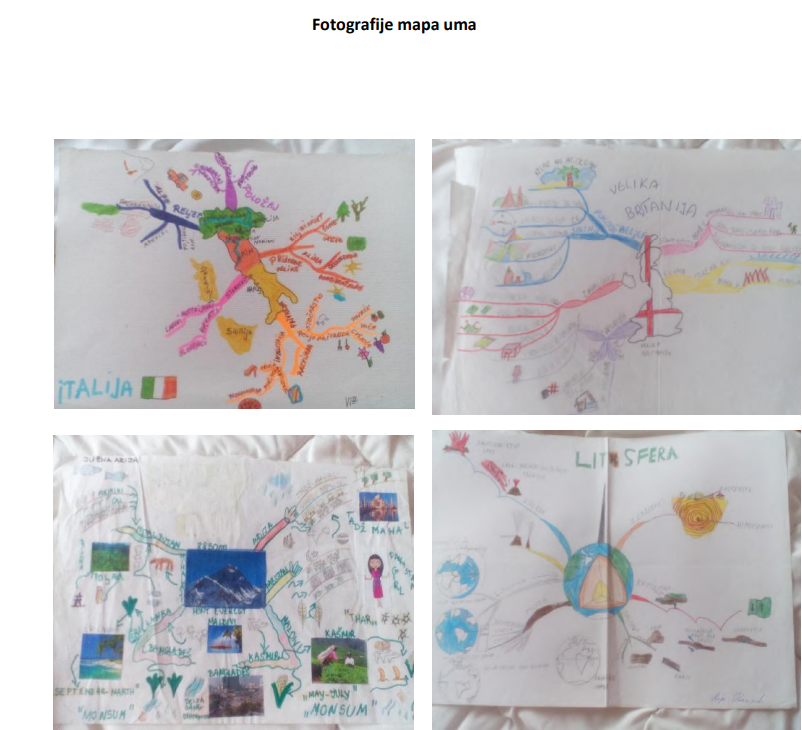 Na početku to je bilo par ilustracija na jednom času a onda sam počela uz mapu uma da koristim što više ilustaracijana objedinjujući ih ujednu moćnu sliku – mapu uma- . Nije to više bio linearni tekst na tabli več bih na čart papiru stvarali jednu veću ilustraciju sa mnogo manjih.To je bila velika slika sa mnogo podataka, informacija ali šarena i sa slikama, kartama, grafičkim prikazima koja im je bila zanimljiva. Učenici su sada rado učestvovali, komentarisali na času pa sam uočila da su i više znali. Dalje sam razvijala kognitivne procese i sve više razvijala smisleno učenje . Insistirala sam da uče ako je to moguće na ovakav način i kod kuće. Dalje smatram da uz mapu uma učenici ne samo da razvijaju kognitivne procese nego i metakognitivne. Stoga i smatram da učeći uz mapu uma kasnije u srednjoj školi, na fakultetima njihovo znanje može da bude i kvantitativno i kvalitativno na zavidnom nivou, ali i da počnu strateški razmišljati i pratiti učenje. Na kraju istraživačkim radom sam uočila da je znanje koje su učenici stekli učeći na ovakav način smješteno u dugotrajnu memoriju – kada bi ih nešto pitala od prije godinu dana sjetili bi se za razliku od ranijekada je to bilo učenje i poučavanje bez mapiranja uma.