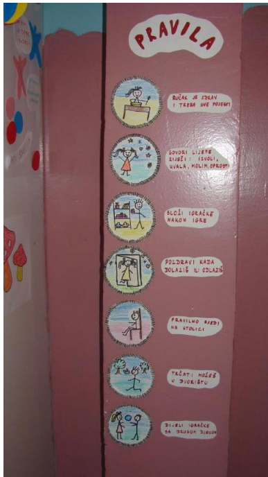 Svako pravilo je ilustrovano i objašnjeno riječima, postavljeno u dijelu grupne sobe na vidljivom mjestu kako za djecu tako i za roditelje.