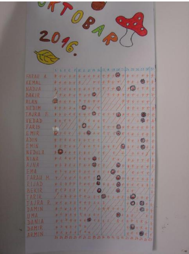 Nakon definisanih pravila grupe, na veliki papir (tri spojena lista iz bloka broj 5) sam napravila tabelu sa imenima djece porednih po abecednom redu (Prilog 3: Fotografija tabele/liste djece za oktobar), do sada za svaki mjesec u ovoj školskoj godini (septembar, oktobar i novembar 2016.).