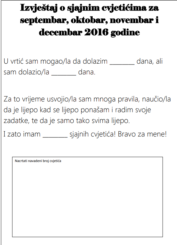 - Dijete će shvatiti da i drugi zaslužuju nagradu i to će prihvatiti na način da se raduje crtanjem istog broja sjajnih cvjetića u Izvještaju.