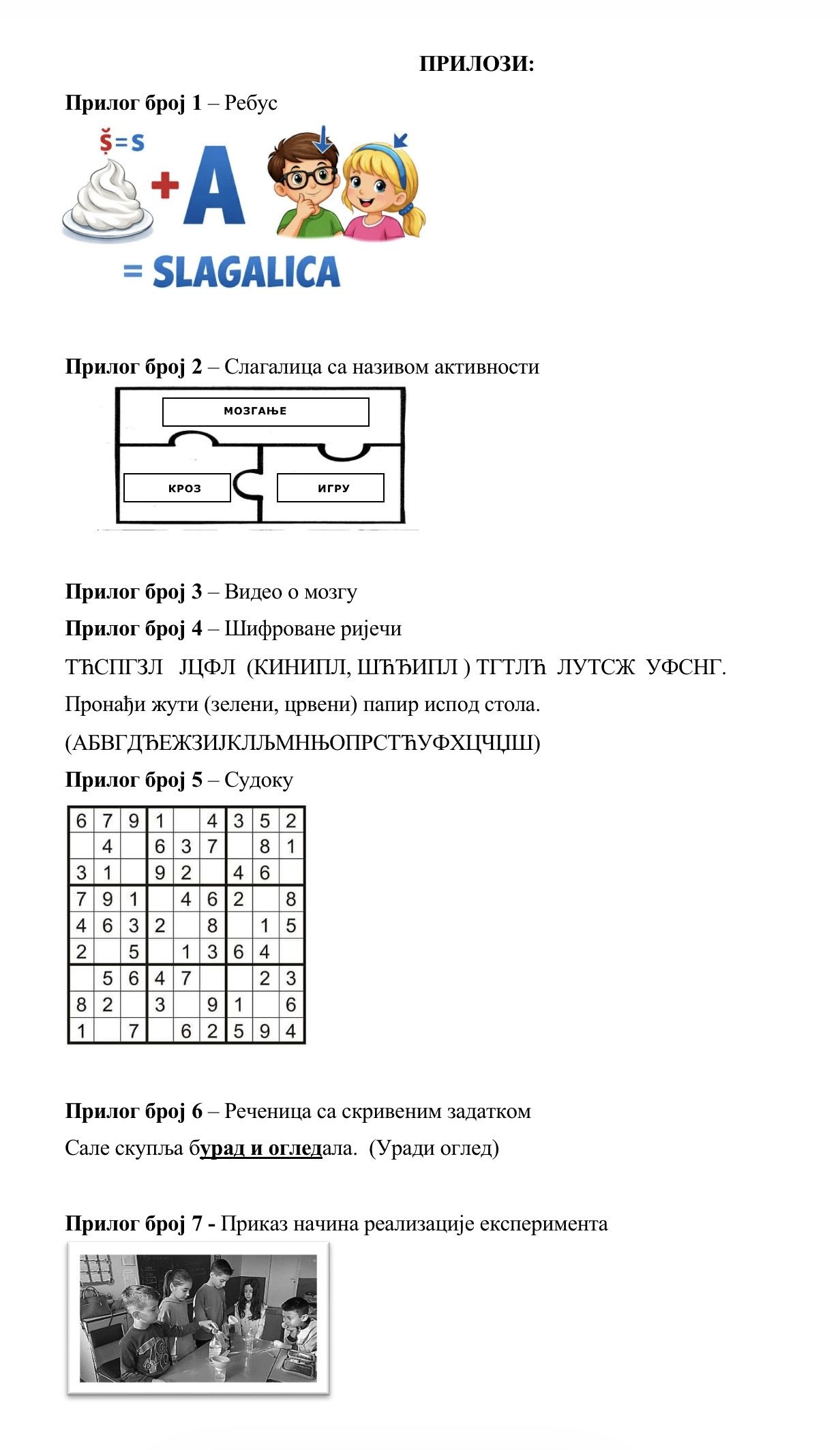 Nakon pronalaska svih predmeta, učenici zajednički formiraju slagalicu koja otkriva naziv teme „Mozganje kroz igru“. Na taj način se uvodi nastavna jedinica i uspostavlja kognitivna povezanost sa prethodnim aktivnostima.