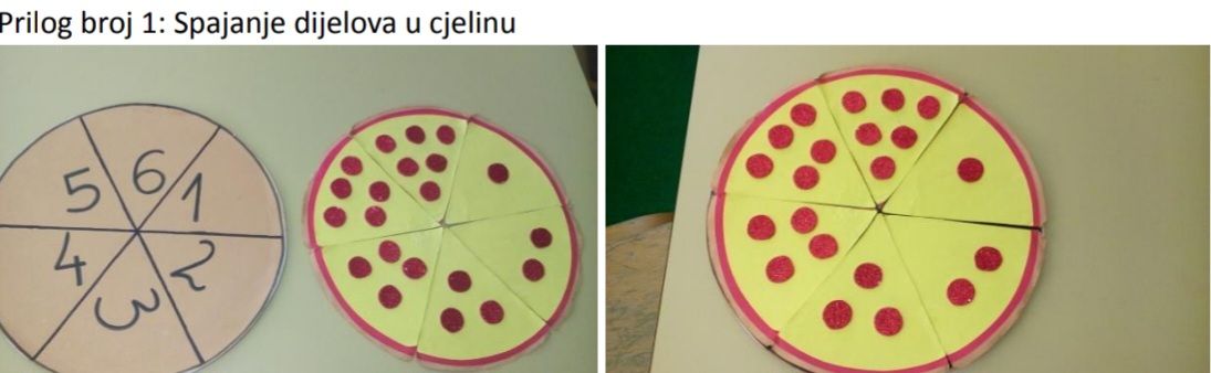 Nakon učeće aktivnosti o pojmovima „dio“ i „cijelo“, prelazimo na rad u manjim grupama po centrima interesovanja, a jedan od njih je i „razigrana pica“. Potrebno je sve dijelove poredati tako da se napravi krug koji je isti kao podloga za picu. Tada upoređujemo koliko dijelova ima ta cjelina i kako ih slažemo sa špicastim dijelom okrenutim unutar kruga. Igru nastavljamo slaganjem dijelova na ploču i konstatujemo da je cjelina popunjena dijelovima iste veličine kao i podloga.