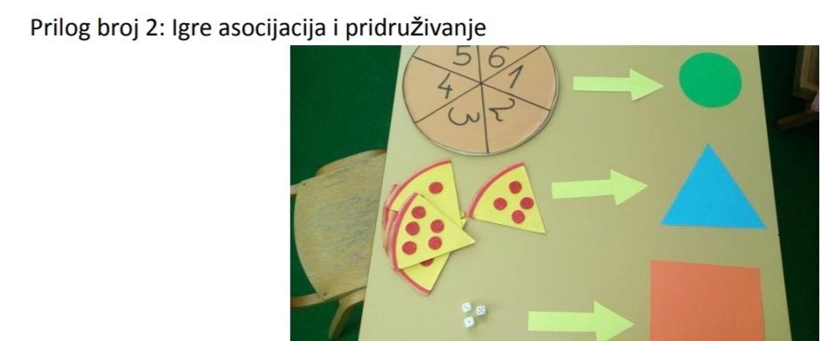 S obzirom da je već mjesec april i da smo planiranim etapnim planovima već imali mnogo aktivnosti na prepoznavanju i imenovanju oblika, sada već možemo reći da ih ponavljamo i uočavamo sa lakoćom. Parče pice nas podsjeća na oblik i djeca izgovaraju da je to oblik trougla. Podloga za picu je sa lakoćom našla odgovor i to je oblik kruga, a kocka sa kojom okušavamo sreću u društvenoj igri sačinjena je od oblika kvadrata. Igru produbljujemo tako što sve dijelove spajamo sa odgovarajućim modelom oblika.