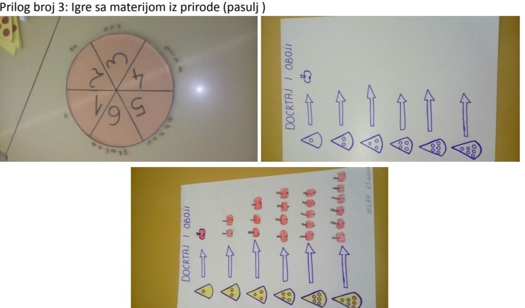 Na parčićima pice nalaze se mali kružići kečapa i oni predstavljaju skupove različite po brojnosti. Djeca prvo uočavaju da svako parče nema jednaku količinu kečapa i porede ih po brojnosti. Zatim na podlozi za picu imenujemo cifre koje prepoznajemo i glasno izgovaramo. Zatim parče sa odgovarajućim brojem kečapića stavljamo na odgovarajuću cifru dok podloga ne bude popunjena i tako ponavljamo igru uz imenovanje brojnosti skupa i cifre. Kada je riječ o radu u manjim grupama, jedna od njih ima pripremljene radne listove sa dijelovima pice i pridruživanjem odgovarajućeg broja jabuka. Druga grupa pridružuje odgovarajućoj cifri određeni broj zrnevlja pasulja.
