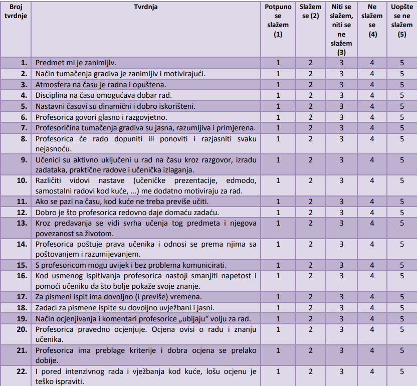 „Kvalitet nastave matematike u Srednjoj ekonomskoj školi Sarajevo“. (Prilog 1: Anketni listić