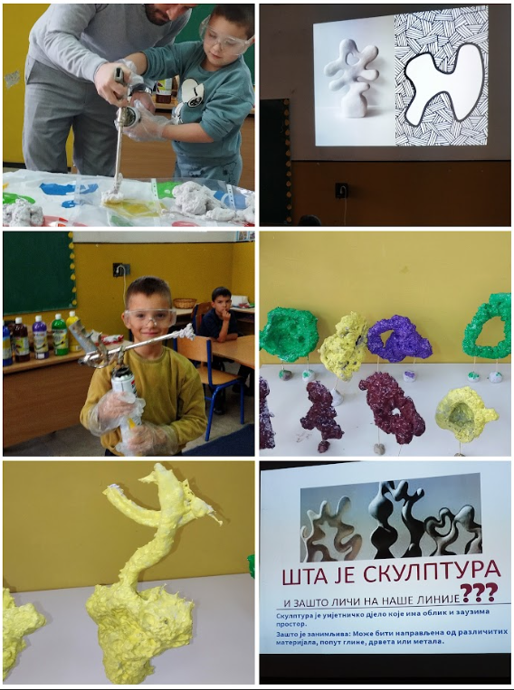 Kroz rad sa pur pjenom, učenici su razvijali svoje vještine oblikovanja i primijenili teoriju linija u praksi. Kada su oblikovali svoje skulpture, bili su oduševljeni promjenama koje su postigli i rezultatima koje su vidjeli. Nakon što su se oblikovani modeli osušili, učenici su ih prebojili prema svom nahođenju. Boje su nanosili četkama, stvarajući razne dezene i boje na svojim skulpturama.