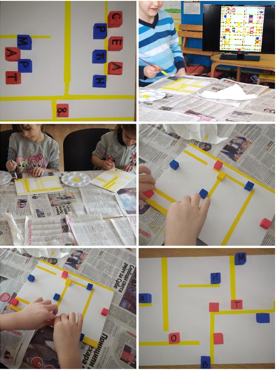 Prva aktivnost osmišljena je tako da učenici razvijaju estetski osjećaj, preciznost, motoričke vještine, kao i sposobnost izražavanja emocija kroz umjetnički rad. Aktivnost započinje prikazom umjetničkog djela na televizoru, koje učenici pažljivo posmatraju i zajedno analiziraju. U razgovoru identifikuju elemente koji ih podsećaju na poznate predmete ili pojave, poput lavirinta ili video igrica, dok istovremeno ponavljaju geometrijske oblike, poput kvadrata i kocke, kao i osnovne i izvedene boje. Nakon analize, učenici preuzimaju materijale: platno dimenzija 20x30 cm, krep traku, kocke, boje i kistove. Prva faza aktivnosti uključuje upotrebu žute krep trake. Učenici pomoću trake oblikuju linije na platnu, koje mogu biti paralelne ili proizvoljne, zavisno od njihovih ideja. Iako je postavljeno umjetničko djelo kao inspiracija, učenici imaju potpunu slobodu u oblikovanju linija, čime se podstiče njihova kreativnost. Nakon postavljanja trake, nanose žutu boju između linija. Kada se boja osuši, traka se pažljivo uklanja, otkrivajući uredne i precizne žute linije. Dok se linije na platnu suše, prelazi se na slikanje drvenih kocki. Učenici biraju osnovne boje – plavu, crvenu i žutu – i koriste ih za bojanje svih strana kocki. Nakon što se boja osuši, na svaku kocku upisuju brojeve od 1 do 7. Na tabli su ispisana slova koja odgovaraju svakom broju, tako da učenici pomoću kockica sastavljaju riječi "VOLIM TE". Slova se lijepe proizvoljno na platno, bez obaveze da slijede tačan redoslijed. Na kraju, gotovi radovi se koriste kao pokloni za drage osobe. Ova aktivnost ne samo da podstiče kreativnost i timski rad, već ima i emocionalnu dimenziju, jer omogućava učenicima da izraze ljubav i zahvalnost kroz umjetničko stvaralaštvo.