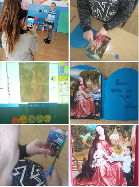 Drugog dana, na času likovne kulture, učenici su izrađivali čestitke povodom Dana žena. Svaki učenik je dobio karton u boji (28x40 cm) koji je presavio kako bi formirao osnovu čestitke. Na prednju stranu čestitke lijepili su reprodukciju umjetničkog djela, zatim isjecali svoje fotografije i integrisali ih u sliku, postajući „drugo dijete“ u umjetničkom djelu. Potom su čestitke ukrašavali i dodavali prigodne poruke.